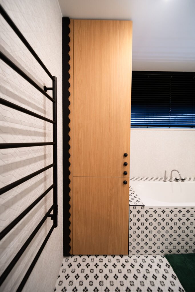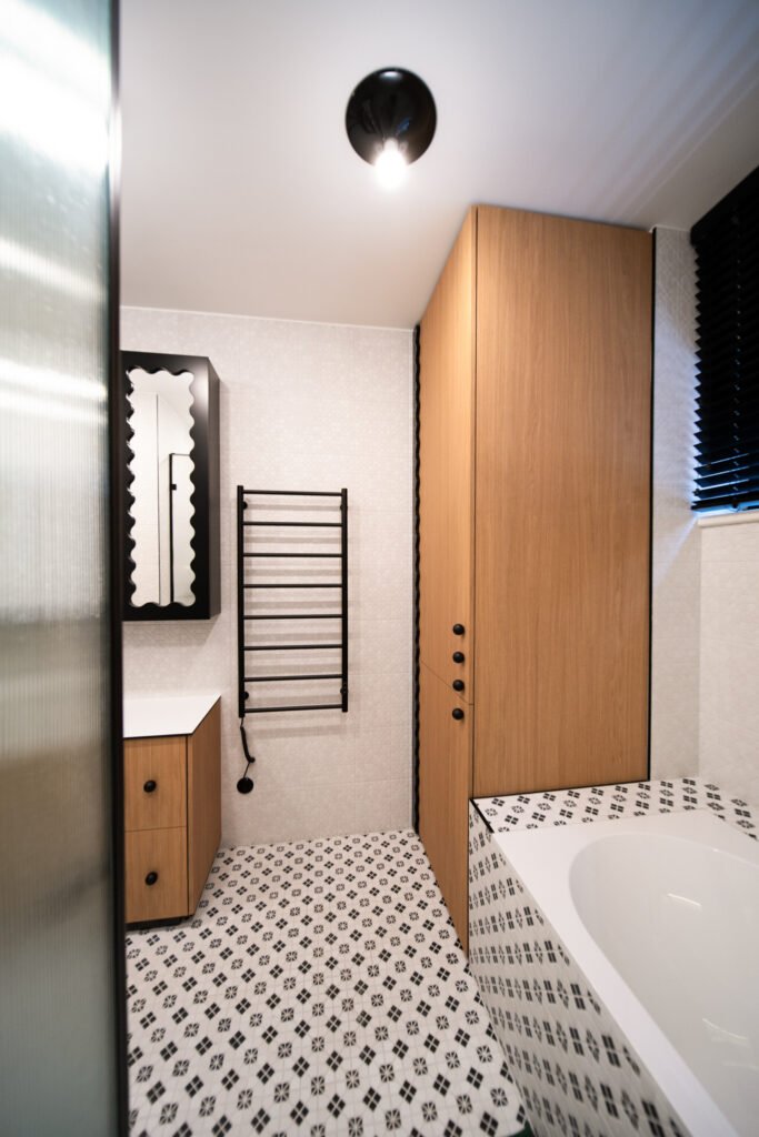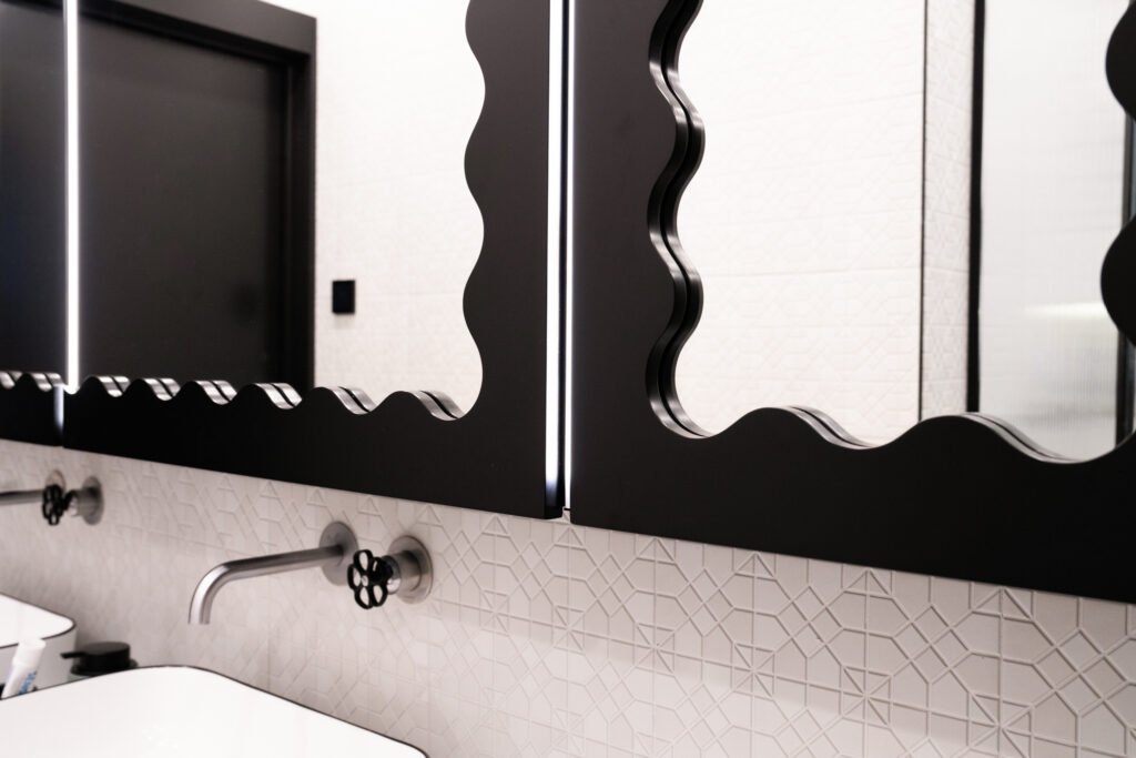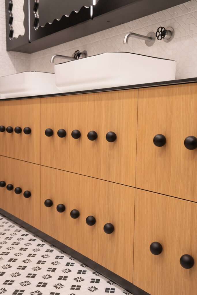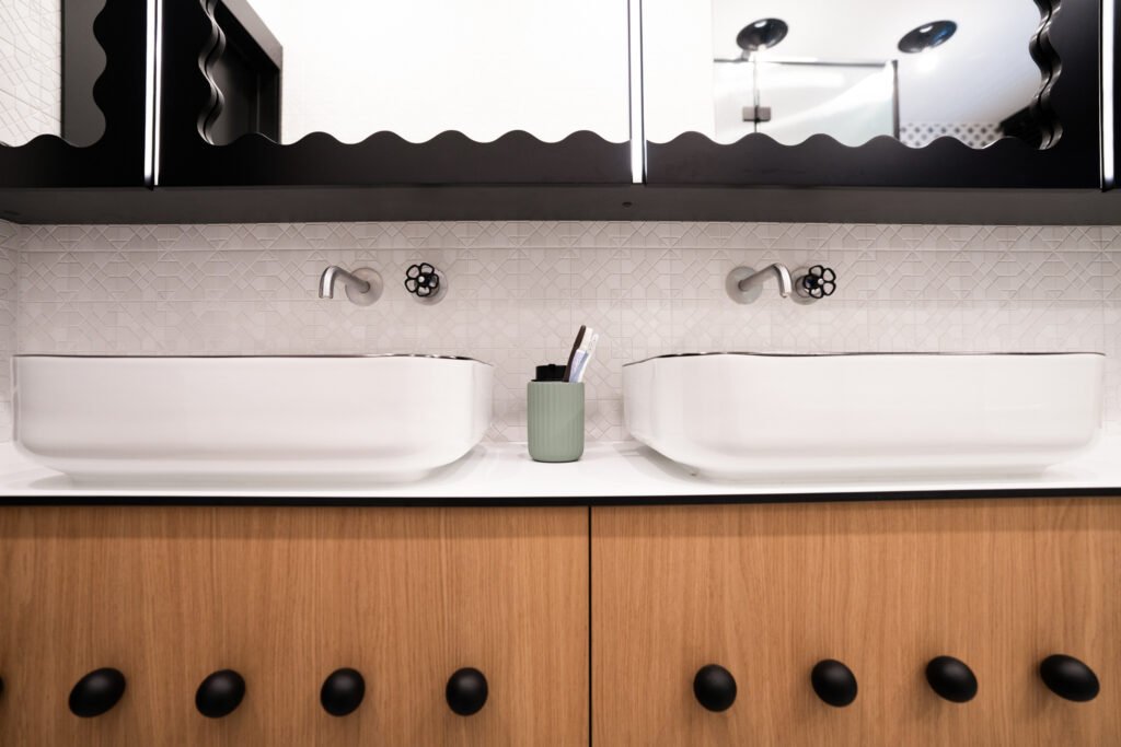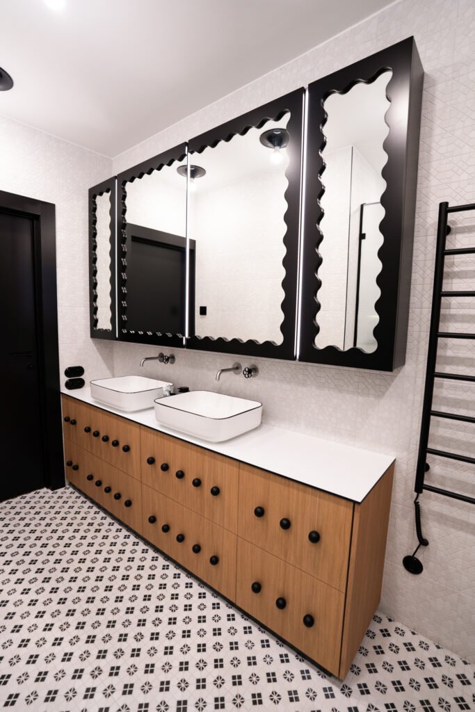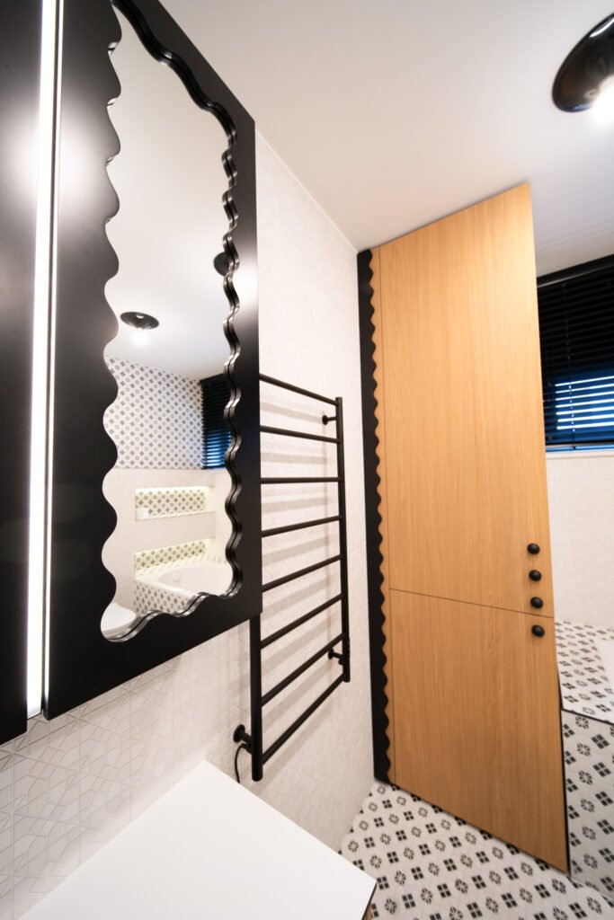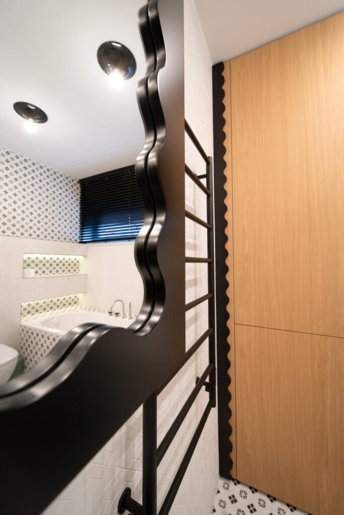 Net ir kasdienės erdvės – prieškambaris ar vonios kambarys – gali tapti ryškiais akcentais, jei jose naudojami netikėti sprendimai. Juodos detalės, nestandartinės formos ir žaismingi spalvų kontrastai padeda interjerui išsiskirti, bet kartu išlaikyti praktiškumą.