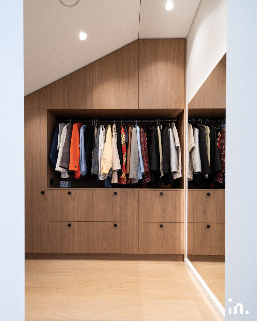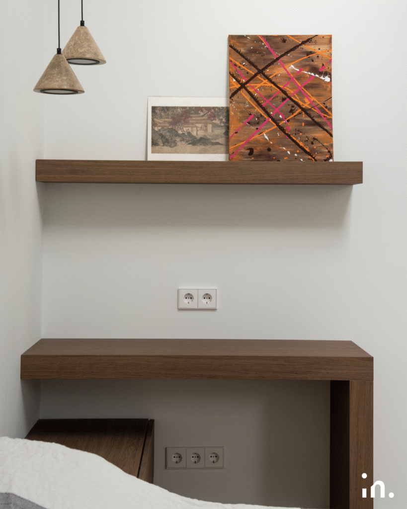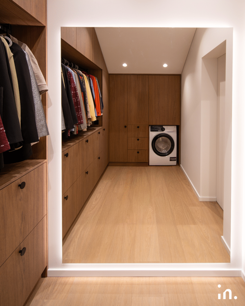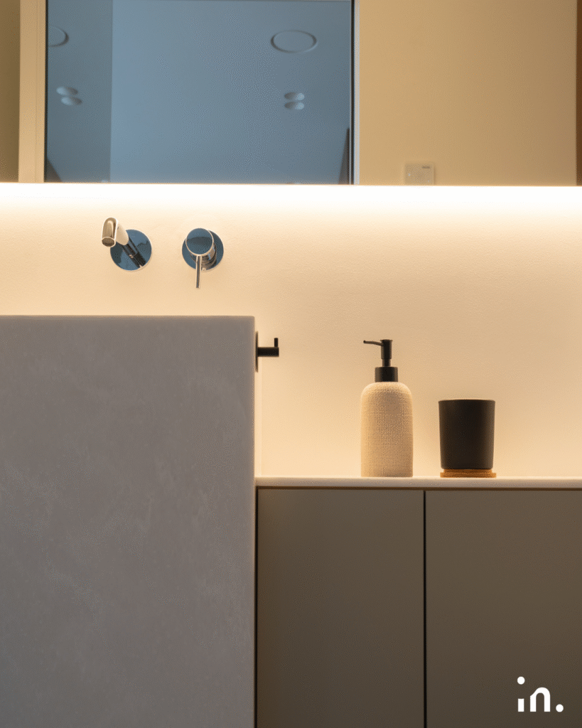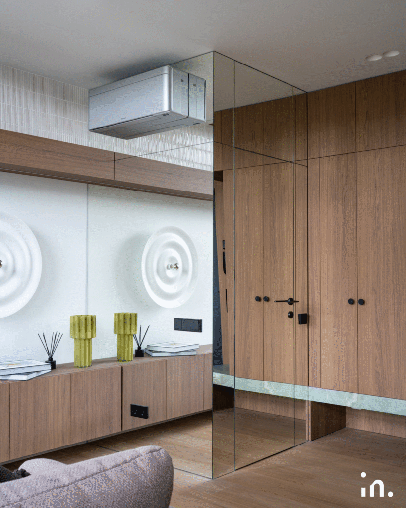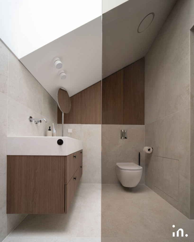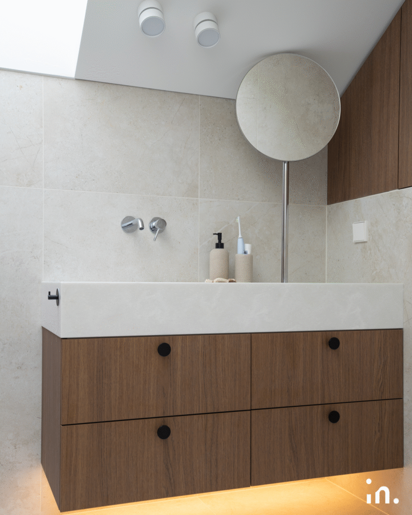 Šis interjero projektas jungia natūralumą ir modernumą. Švelnūs medžio raštai sukuria šilumos ir jaukumo pojūtį, o žalios plytelės tampa išskirtiniu akcentu, suteikiančiu erdvei gaivos ir charakterio. Kruopščiai parinktos šviesios spalvos ir subtilūs kontrastai leidžia baldams ir medžiagoms atsiskleisti natūraliai, išlaikant harmoningą visumą.